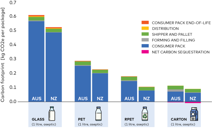 The cartons’ light weight is part of the reason for this, as well as the relatively low impact of paperboard per kilogram. Another reason is that, when cartons are disposed of in landfill, they may only partly release the carbon sequestered when the trees were growing. This means that the cartons can be net sequesters of carbon: the emissions (methane and carbon dioxide) released when the paperboard decomposes in landfill are lower than the amount of carbon stored in the paper.
