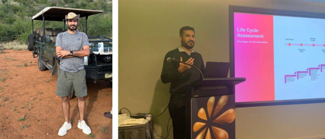 Left: Umer on a safari in South Africa | Right: Presenting at the ALCANZ conference on the Gold Coast in Australia, 2025