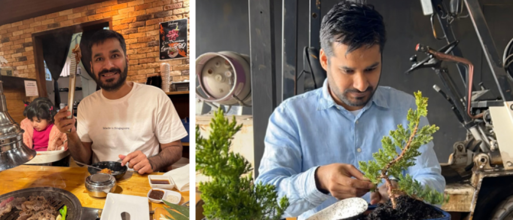 Left: Umer enjoying his favourite meal - Korean barbeque! | Right: Shaping a Bonsai plant