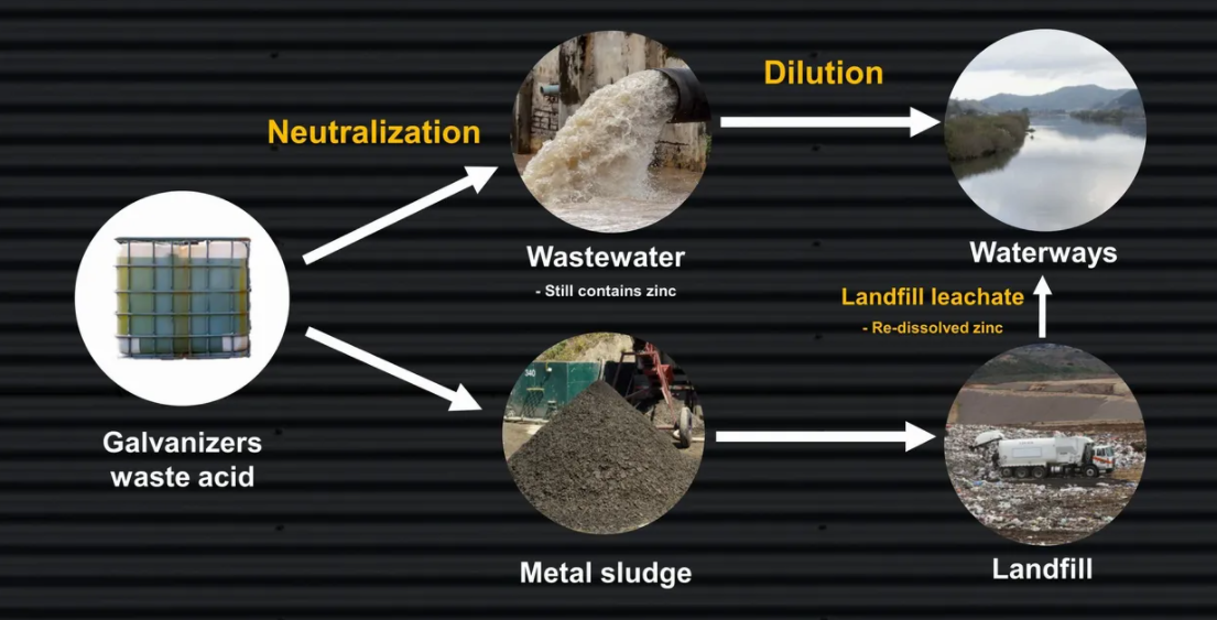 The galvanised steel industry produces a waste acid with a high concentration of zinc — an eco-toxin that is essential for humans in trace amounts but toxic to aquatic life. Generally, this is disposed of via wastewater and landfill after treatment. However, this results in the loss of zinc, a useful mineral, and its incomplete removal from wastewater degrades most sewage treatment processes and causes environmental damage to waterways.