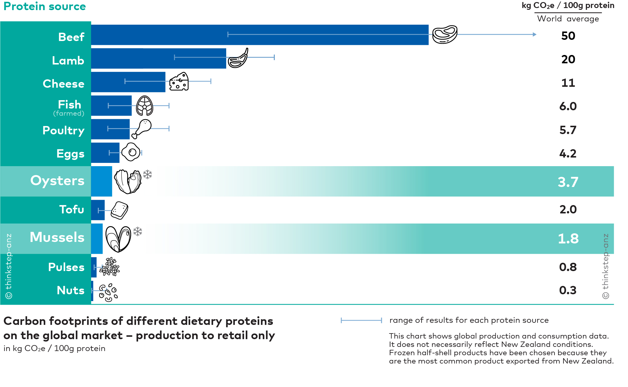 New Zealand mussels and oysters are among the animal protein sources with the lowest carbon footprint. Shellfish farmed in New Zealand have a lower carbon footprint than all other animal-derived protein sources, including farmed fish.