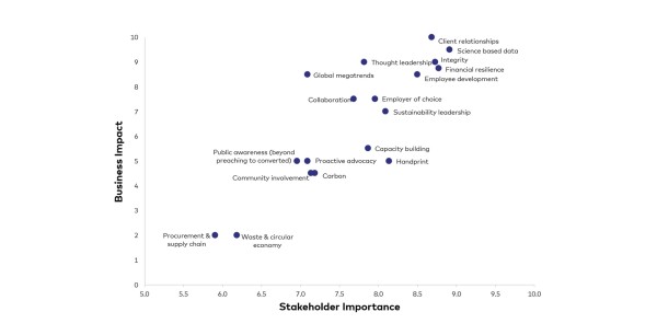 The result was a materiality matrix; (generic example below) which plotted stakeholder concerns against potential business impact. This matrix helped Electrix’ leadership prioritise issues in its sustainability strategy and understand where these priority issues ‘sat’ in the business. Who was responsible? What progress were they making? What did they need to achieve? How were they reporting outcomes?
