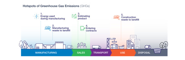 We wrote this case study for WWB to use in their own communications. It explains how we worked with the manufacturer to identify five ‘hotspots’ of greenhouse gas emissions (GHGs) for construction waste (below), and how WWB are using circular economy to address the issues.