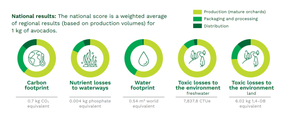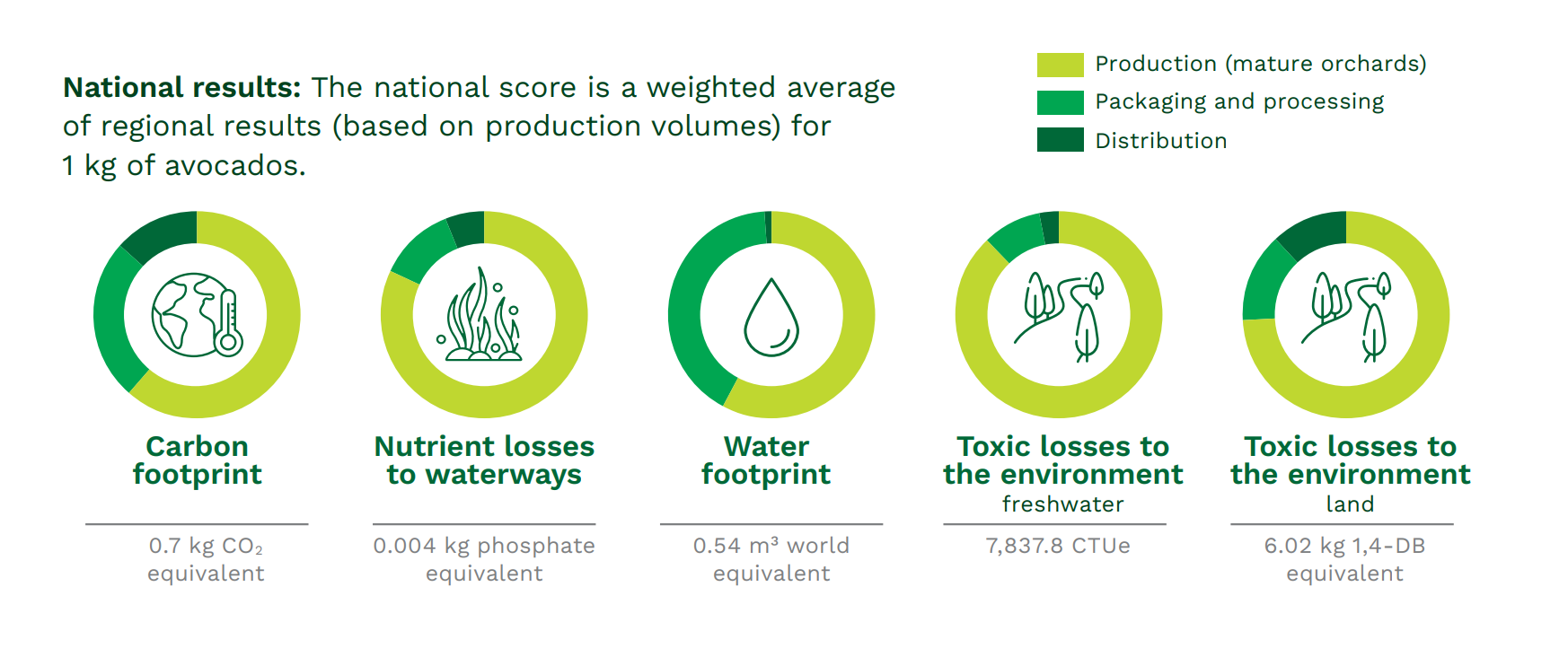 The carbon footprint is 0.7kg of CO2-eq for each kg of packaged Hass avocados produced in Aotearoa New Zealand. These are the other measured impacts: